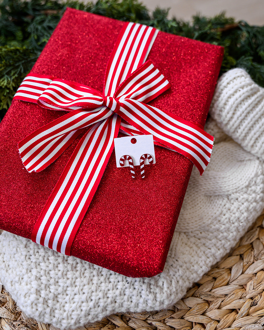 Red and ivory striped candy cane earrings with red glitter - 1"