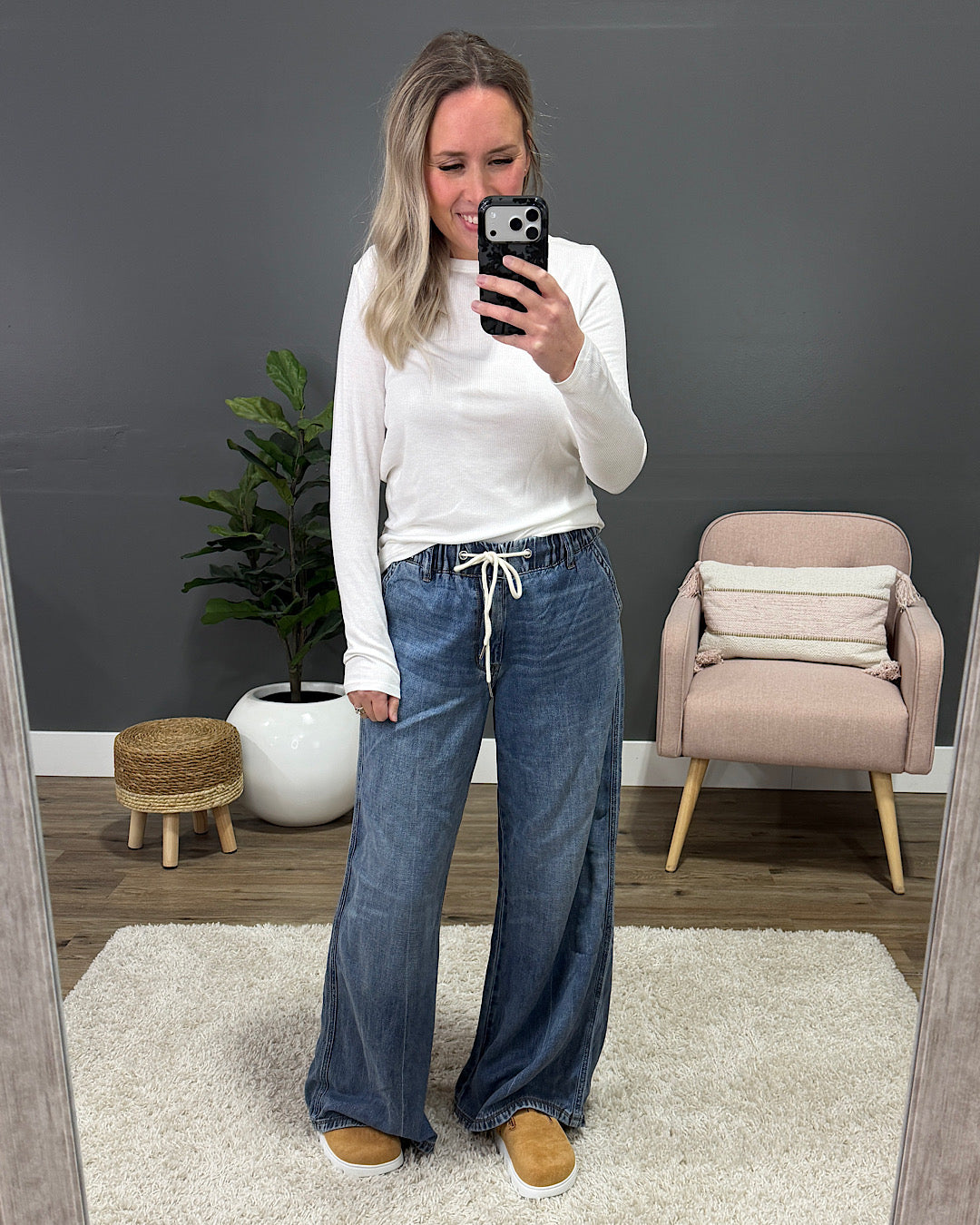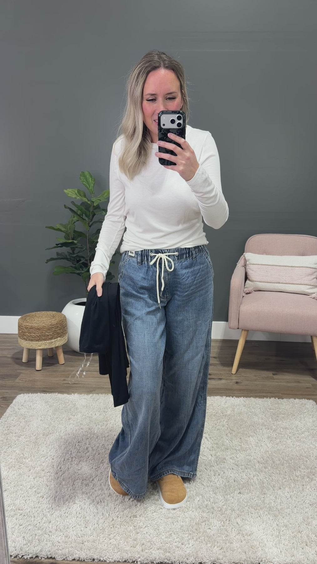 Alyssa is 5'5" and wears a size 25 in jeans, a small in bottoms and a small in tops.