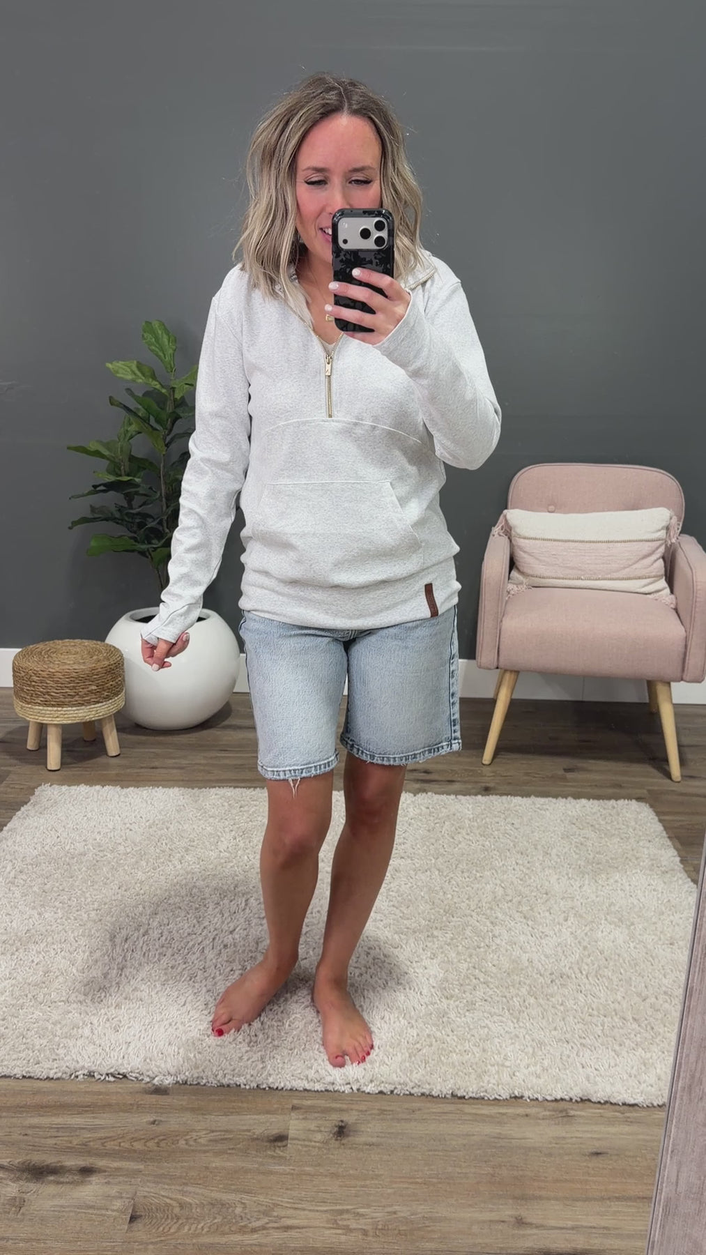 This cozy half zip hoodie is the kind of comfy layer you’ll reach for on busy mornings, school drop-offs and casual weekend plans. The soft cotton blend with good stretch keeps it comfortable while the gold zipper, kangaroo pocket and thumbholes add those little details that make it feel extra good to wear.
