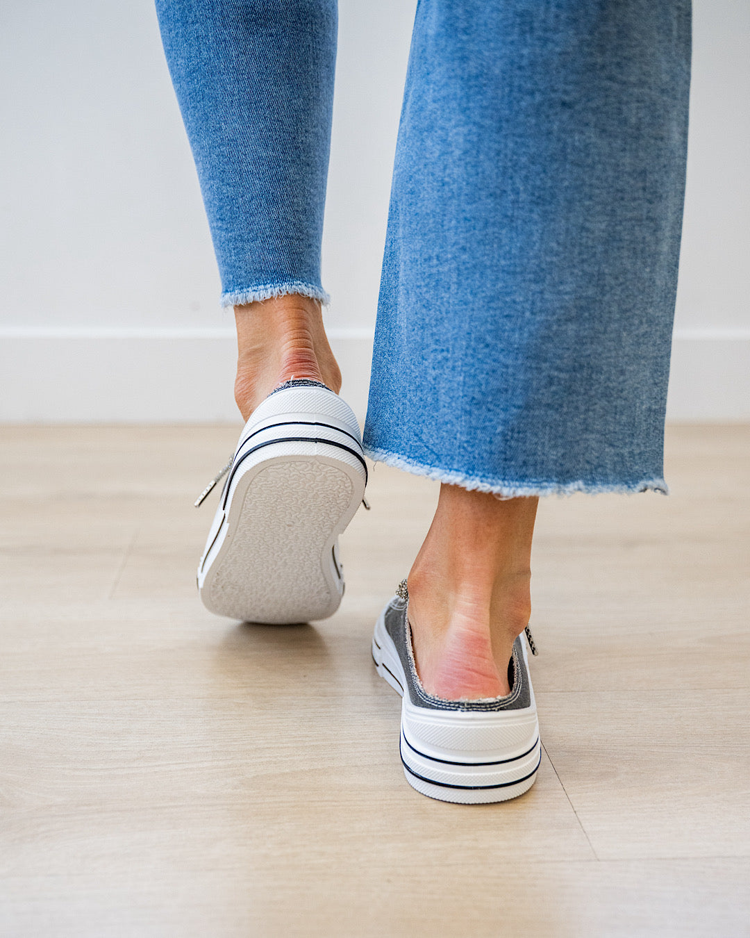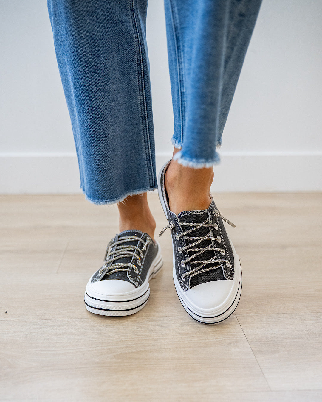 These sneakers add a fun, elevated touch to your everyday look. The rhinestone laces and subtle colored accents give them a stylish pop, while the squishy footbed keeps them comfortable for all‑day wear. With the slip on feature they are great for when you are running out the door and need a pair of cute stylish shoes quick!